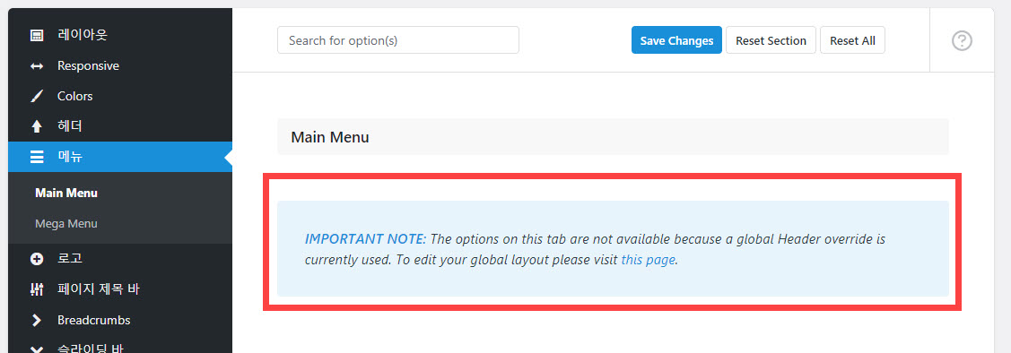 이상으로 아바다 테마의 메인 메뉴 크기 등을 조정하는 방법에 대해 간단히 살펴보았습니다. 앞서 언급했듯이 일부 데모는 레이아웃 템플릿으로 헤더가 작성되었을 수 있습니다. 그런 경우에는 아래 그림과 같이 "The options on this tab are not available because a global Header override is currently used. To eidit your global layout please visit this page"와 비슷한 메시지가 표시됩니다. 그러면 해당 링크(this page의 링크)를 클릭하여 글로벌 레이아웃을 편집할 수 있는 페이지로 이동할 수 있습니다.