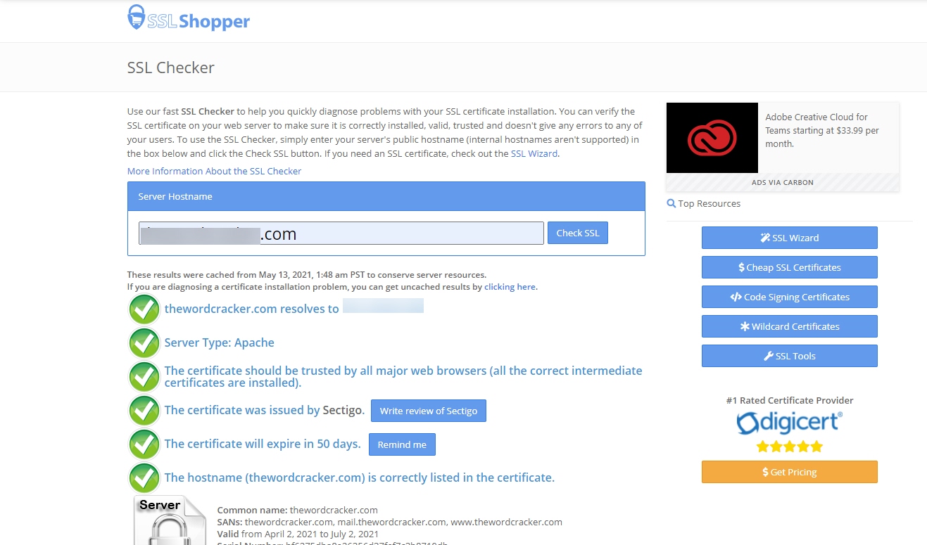 이 문제에 대해 SiteGround에 문의하니 현재 SSL 인증서는 정상적으로 설치가 되었다고 알려주었습니다. SSL checker 사이트에서 인증서가 올바르게 설치되었는지 확인할 수 있습니다.