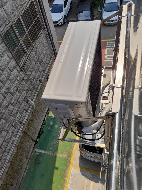 베란다 외부에 실외기를 설치했습니다. 앵글 비용으로 120,000원을 지불했습니다.