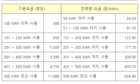 본격적인 더위가 시작되어 에어컨을 가동하고 있습니다. 쾌적 모드로 가동했을 때 평균 3시간에 2kWh를 소비하는 것 같습니다. 가정용 전기의 경우 전기 소비량 구간별로 요금이 차등 적용됩니다.