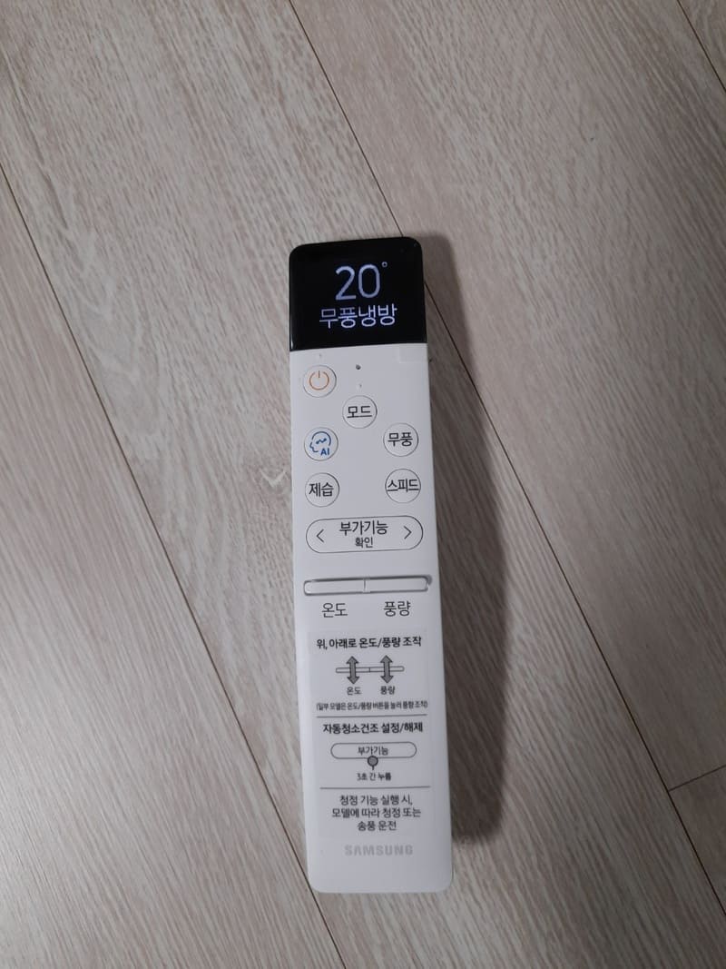 AI(인공지능) 쾌적 기능, 무풍 기능, 스피드 기능, 제습 기능을 쉽게 선택할 수 있도록 버튼이 있습니다. 스피드 기능은 외부에서 실내로 들어왔을 때 빠르게 냉방하려는 경우에 사용할 수 있습니다. 처음에는 스피드 버튼을 눌러 빠르게 온도를 낮춘 후에 무풍 기능으로 전환하면 쾌적하다고 하네요.