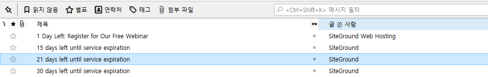 서비스가 종료되기 전 몇 차례 이메일로 서비스 만료를 알리는 이메일이 전송될 것입니다. SiteGround의 경우 살펴보니 서비스 종료 30일 전, 21일 전, 15일 전, 1일 전에 알림이 전송되네요.