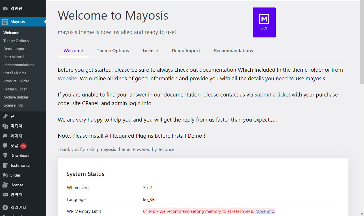 Mayosis 테마 데모 설치하기