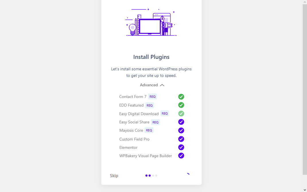 Mayosis 테마를 업로드하여 설치하고 활성화하면 Mayosis 마법사가 실행됩니다.