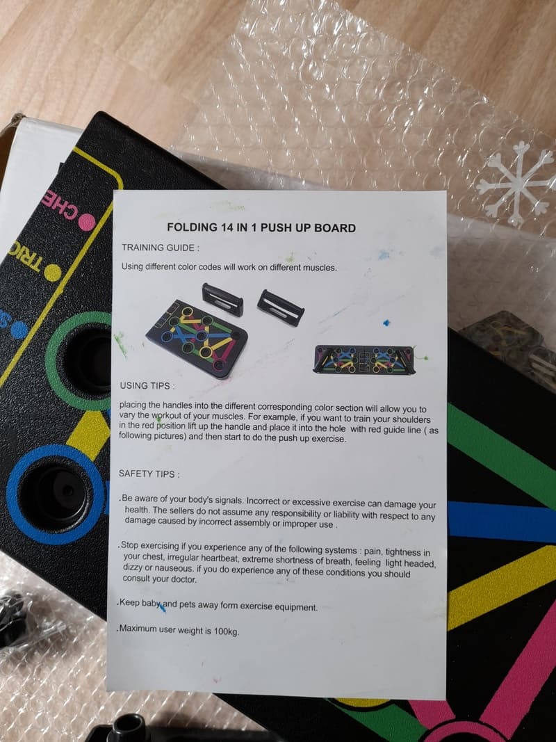 포장을 개봉하면 푸쉬업바, 보드, 캡, 설명서(1장)가 들어있습니다.