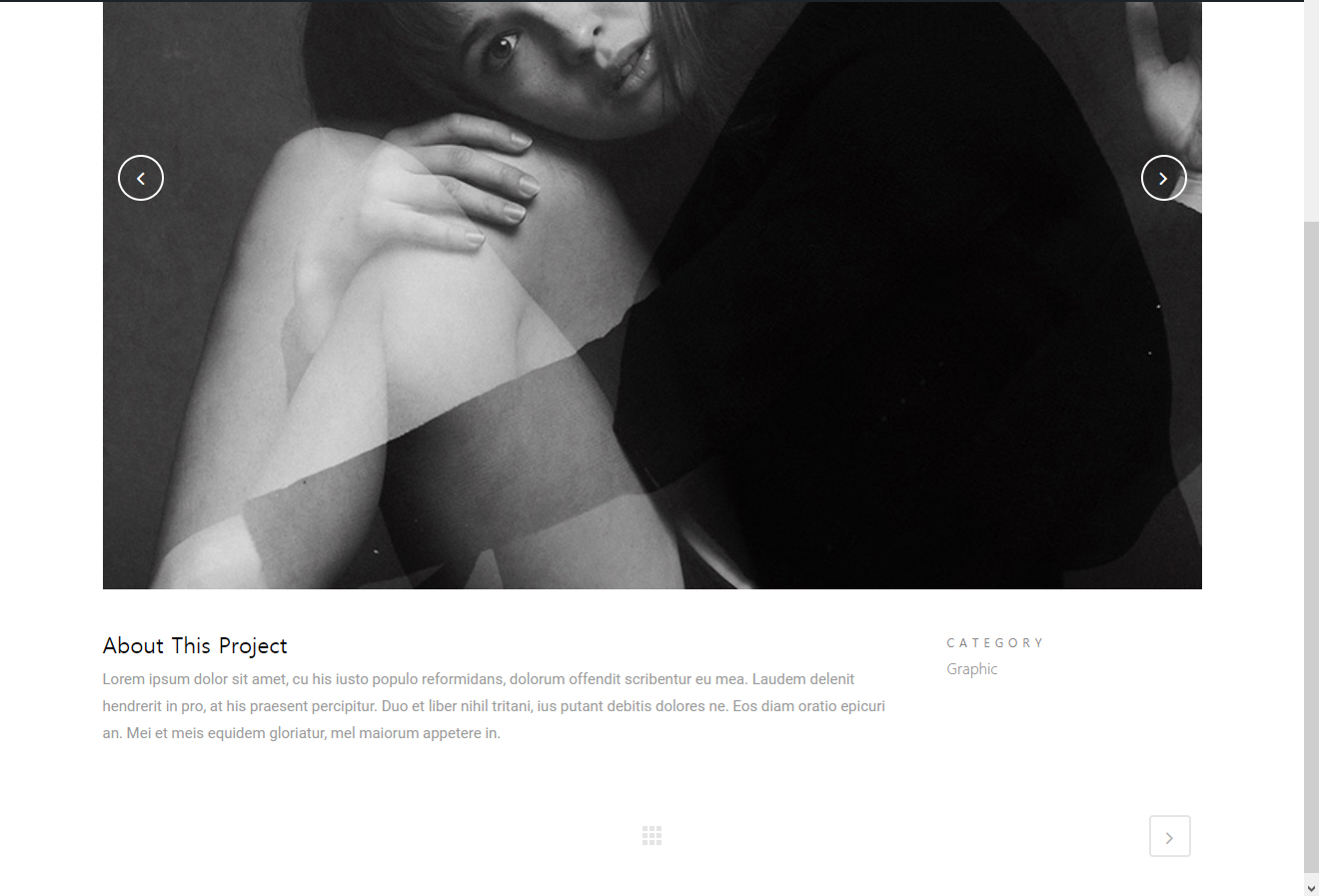 개별 포트폴리오 페이지에는 그림과 같이 포토폴리오 슬라이더가 상단에 표시되고 아래에 포로젝트 관련 설명이 표시됩니다.