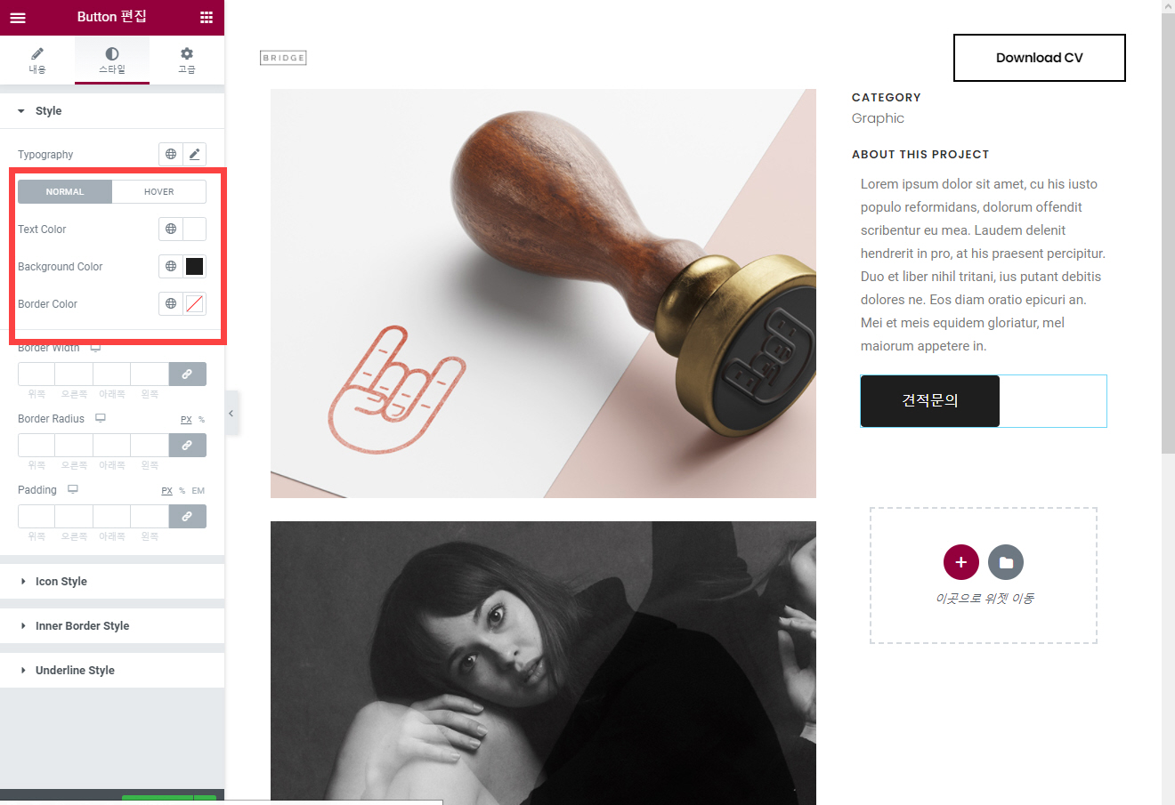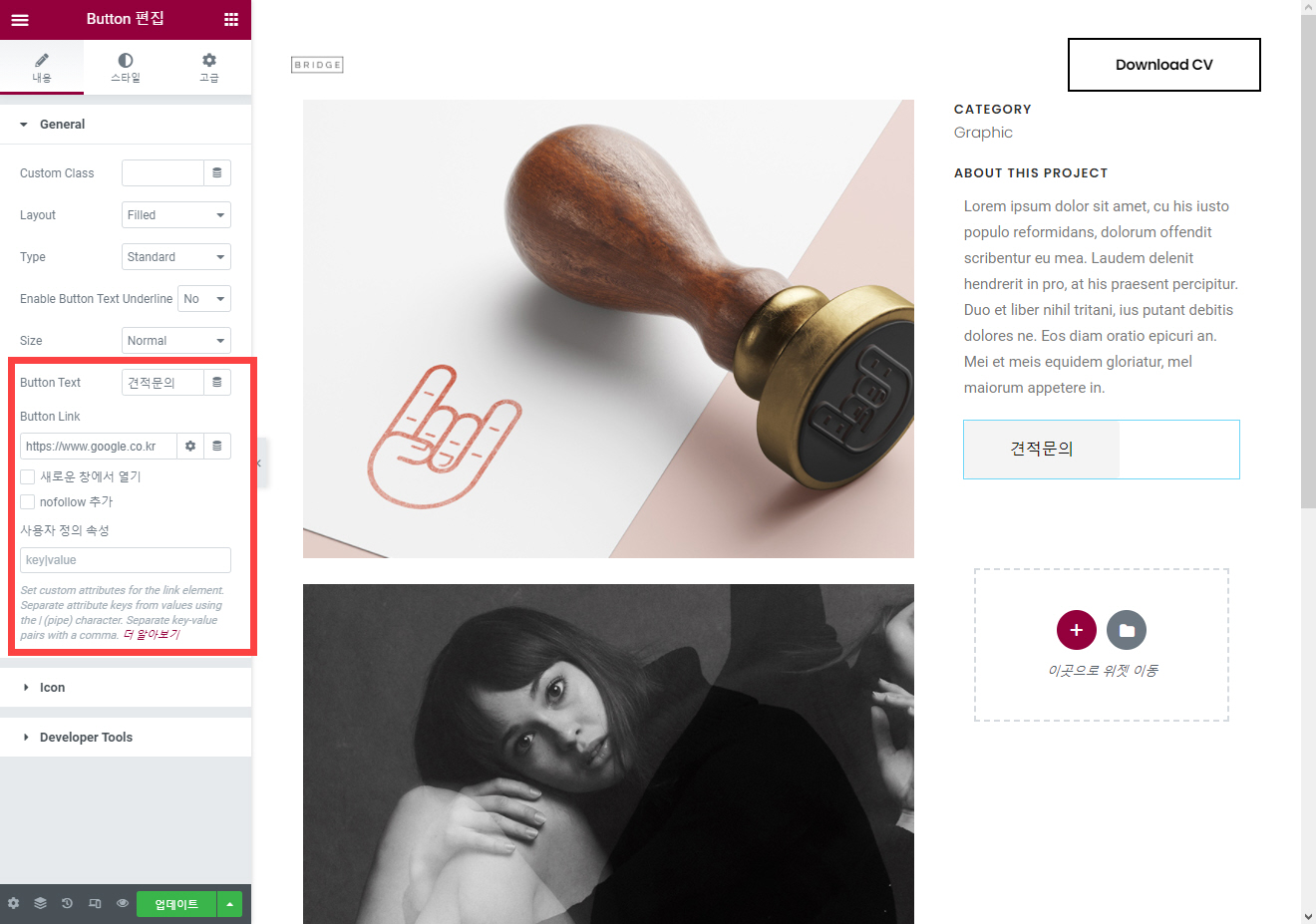 이제 개별 포트폴리오 편집 페이지에서 오른쪽의 적당한 위치에 Button 엘리먼트를 추가합니다.