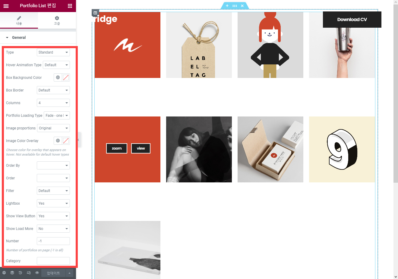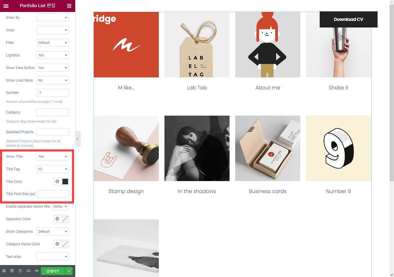 포트폴리오 페이지에 Portfolio List 위젯을 적절한 위치로 끌어도 놓습니다.