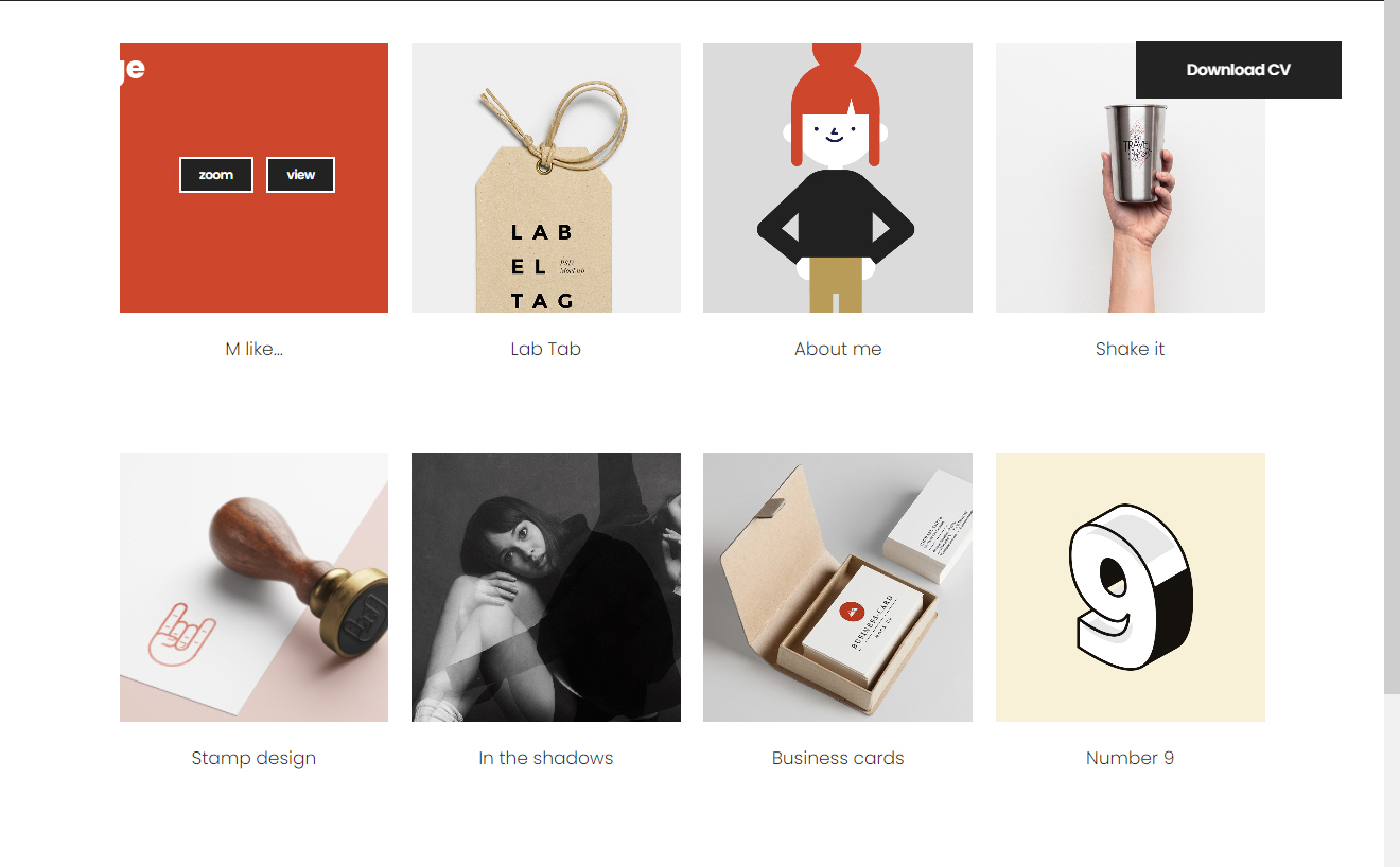위의 영상에서와 같이 포트폴리오 페이지에 포트폴리오 항목들이 썸네일과 제목으로 표시되어 있고, 썸네일 위에 마우스를 올리면 Zoom과 View 버튼이 표시됩니다.
