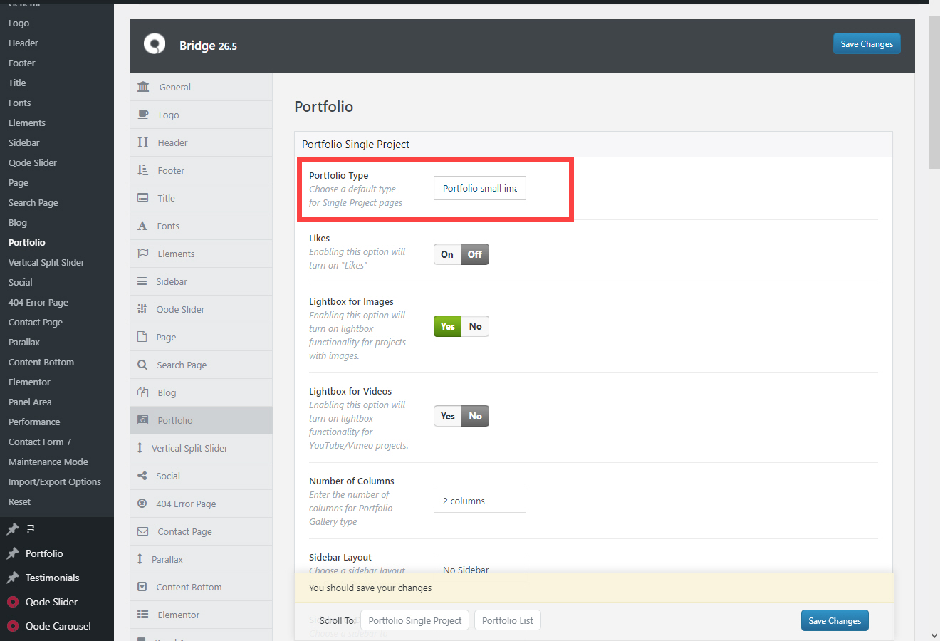 Qode Options > Portofolio를 클릭하고 Portfolio Single Proejct 섹션 아래의 Portfolio Type을 Portfolio small images로 변경합니다.