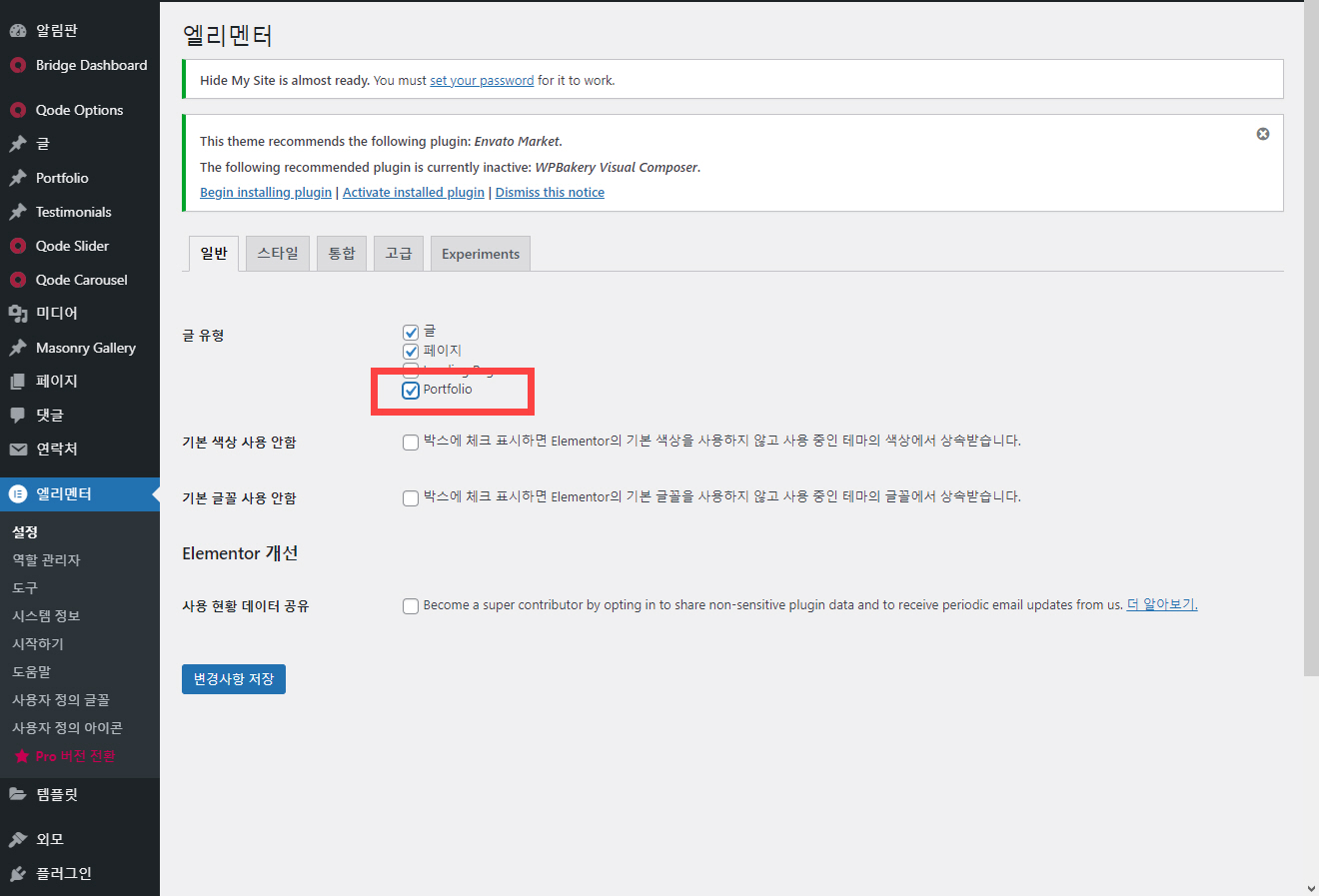 엘리멘터 > 설정으로 이용하여 글 유형에서 Portfolio를 체크하고 저장합니다.