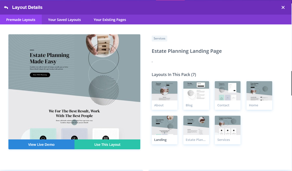 레이아웃 팩은 7~9개의 레이아웃 페이지로 구성되며, Divi 테마의 Divi 빌더 내에서 로드할 수 있습니다. 특정 레이아웃 페이지를 로드하여 편집하거나 여러 개의 레이아웃을 동시에 로드하여 불필요한 부분은 삭제하고 필요한 부분만 활용하는 것도 가능합니다.