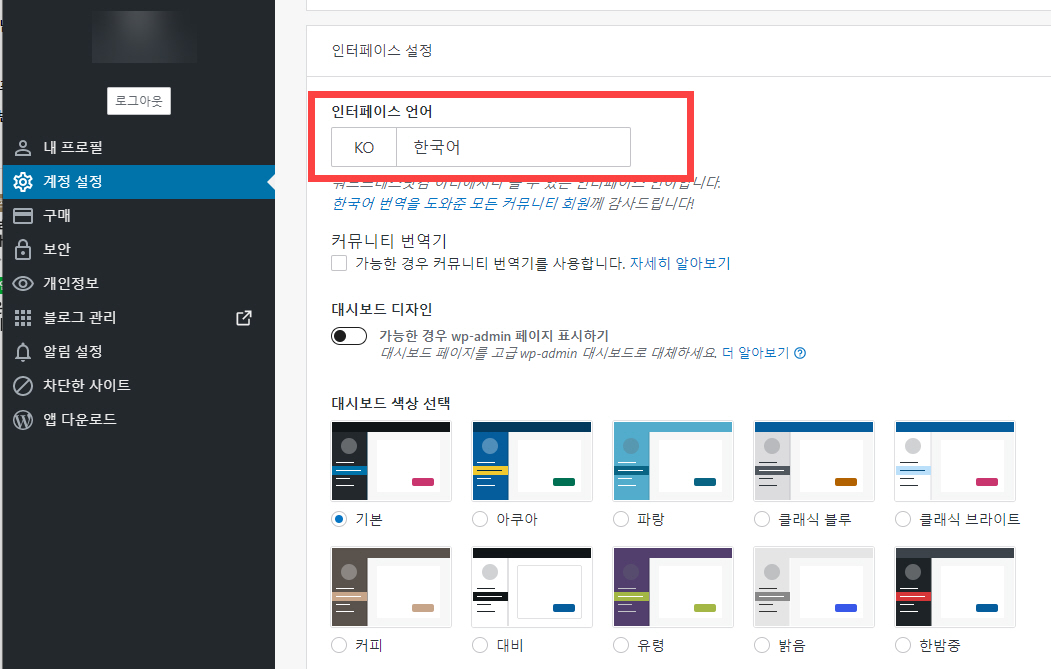 가입형 워드프레스에서 사이트 언어와 인터페이스 언어 설정/변경하기