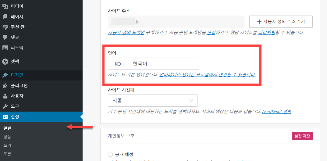 가입형 워드프레스의 사이트 언어 설정/변경은 설치형과 비슷합니다.