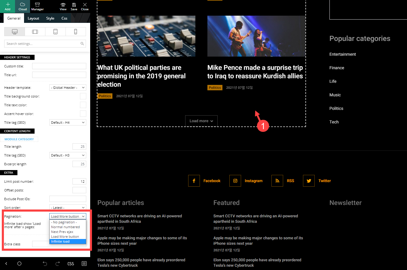 다양한 옵션이 제공되므로 마음에 드는 것을 선택하시기 바랍니다. Infinite load를 선택하면 글 목록 하단으로 스크롤하면 자동으로 계속 글이 로드됩니다.