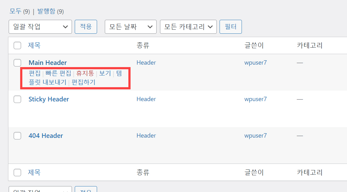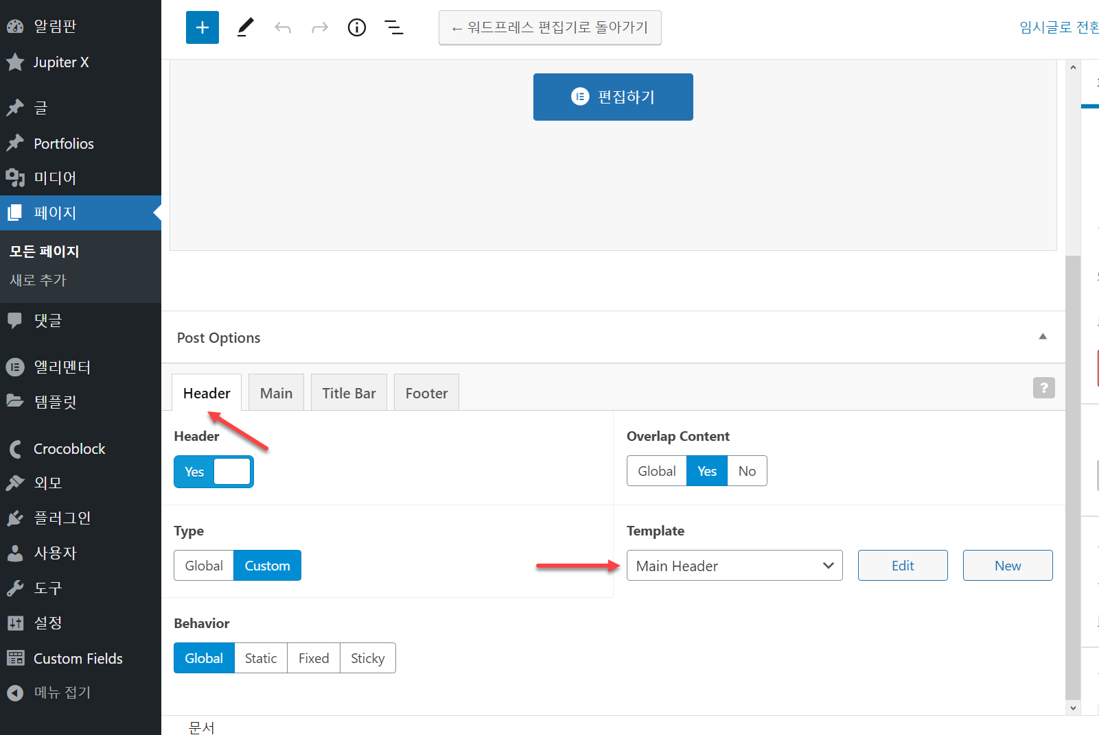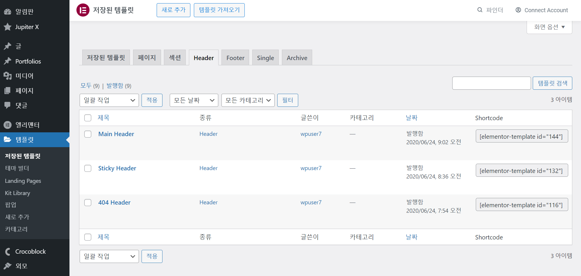 워드프레스 주피터 테마 헤더 설정하기 (+Elementor 템플릿)