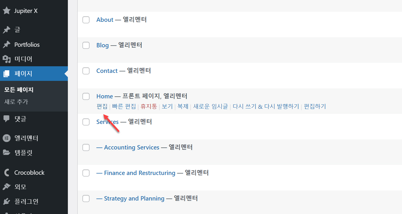 편집을 클릭합니다. 맨 우측의 "편집하기"를 클릭하면 엘리멘터 페이지 빌더에서 페이지가 열립니다. 여기에서는 맨 왼쪽에 있는 "편집"을 클릭합니다.