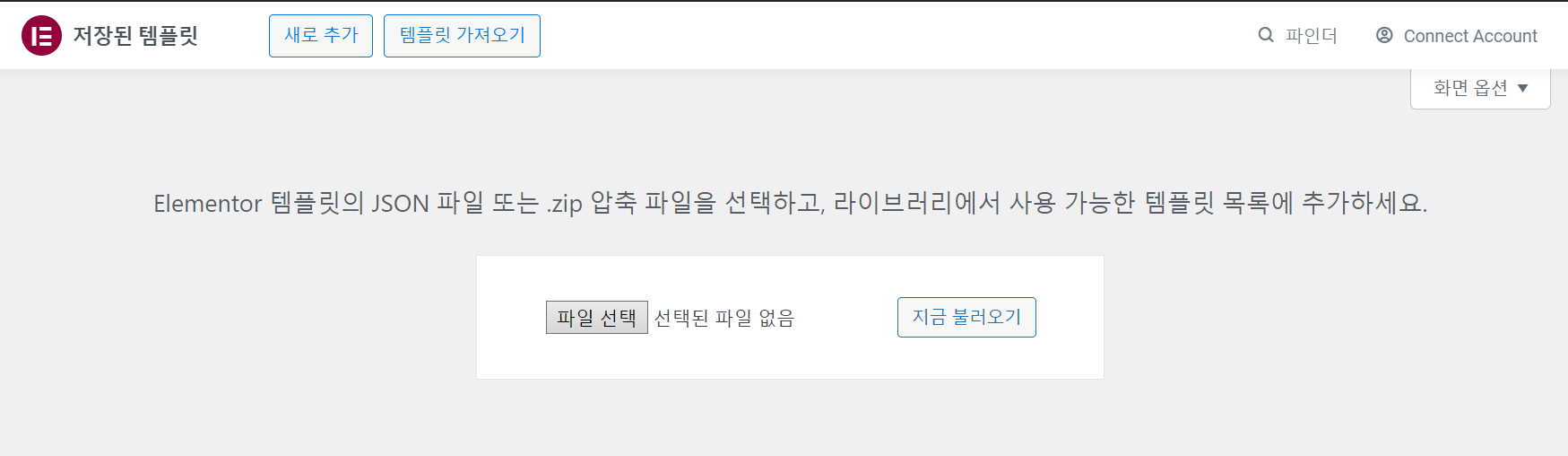 Main Header, Sticky Header, 404 Header 템플릿이 있는데요. 기본적으로는 페이지에는 Main Header 템플릿이 적용되어 있습니다. 새로 템플릿을 만들거나 템플릿을 가져올 수 있습니다. 상단의 "템플릿 가져오기"를 클릭하면 "Elementor 템플릿의 JSON 파일 또는 .zip 압축 파일을 선택하고, 라이브러리에서 사용 가능한 템플릿 목록에 추가하세요"가 표시되면서 파일을 선택할 수 있는 섹션이 표시됩니다.