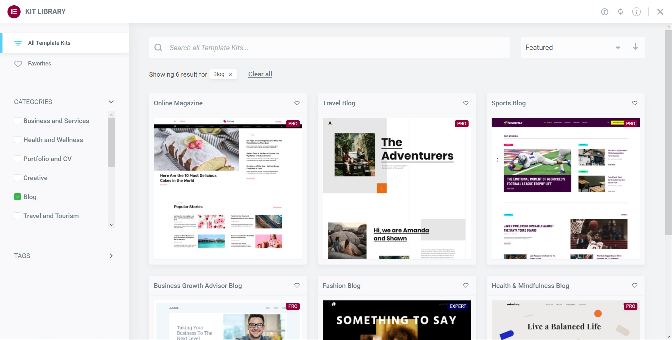 왼쪽 패널에서 카테고리나 태그 항목을 체크하여 원하는 카테고리나 키워드의 템플릿 키트를 표시할 수 있습니다. 또는, 오른쪽 상단의 Search all Template Kits... 필드에 키워드를 입력하여 검색할 수 있습니다.