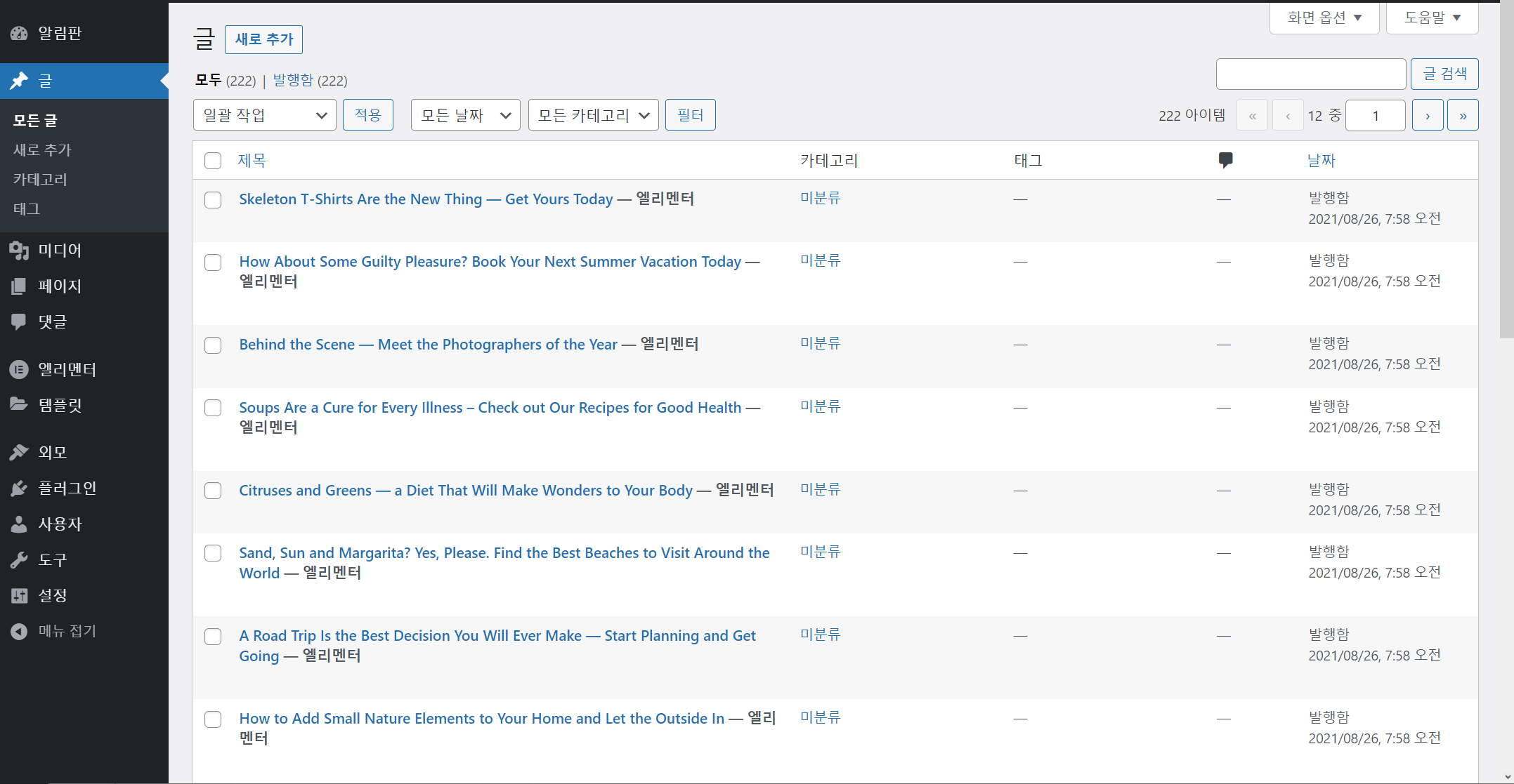 페이지와 글도 살펴보면 키트에 포함된 페이지와 글이 로드되어 있는 것을 확인할 수 있습니다.