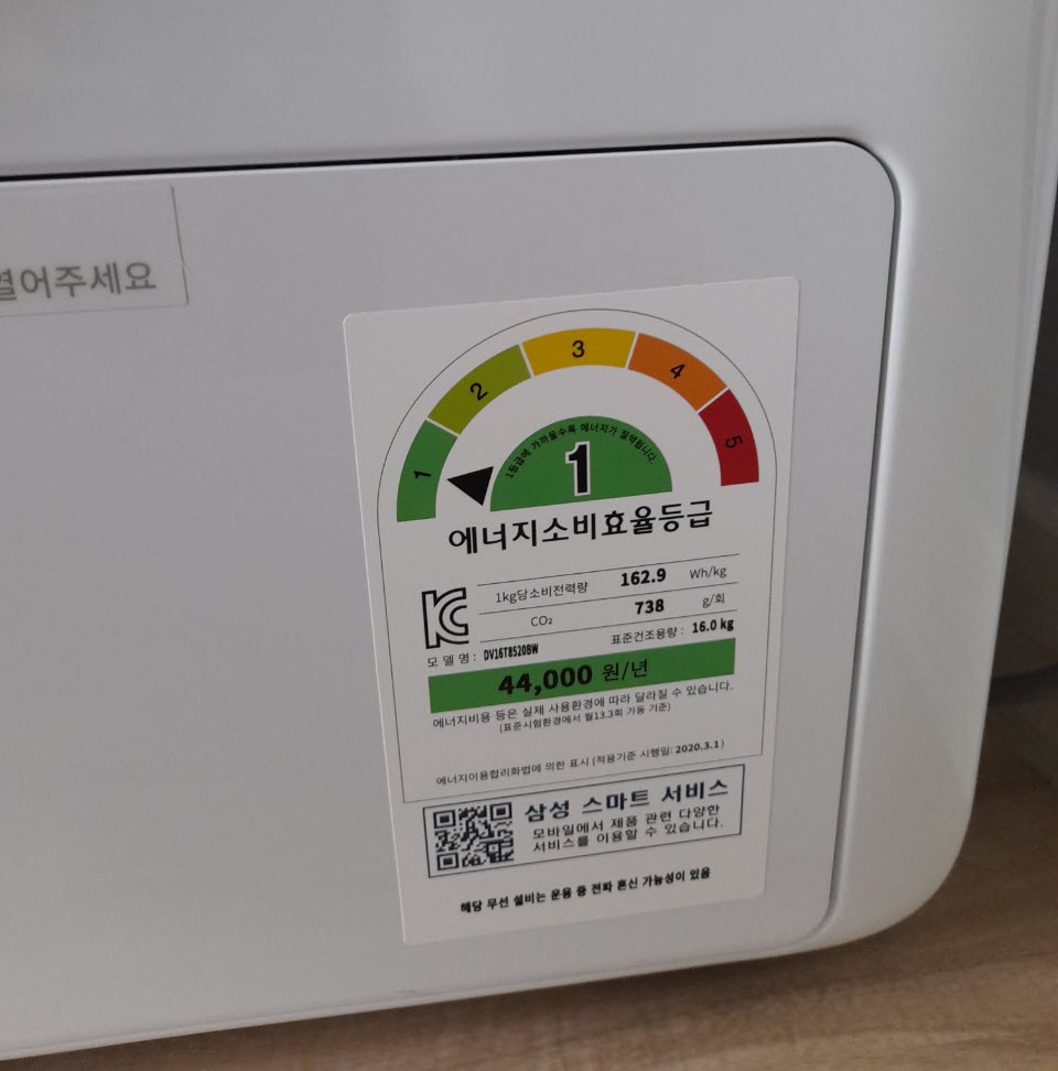 에너지 소비 효율은 1등급이고 1kg당 소비전력량이 162.9Wh/kg으로 표기되어 있고, 연간 전기세가 44,000원으로 표시되어 있네요. 어떤 기준인지는 모르겠습니다.