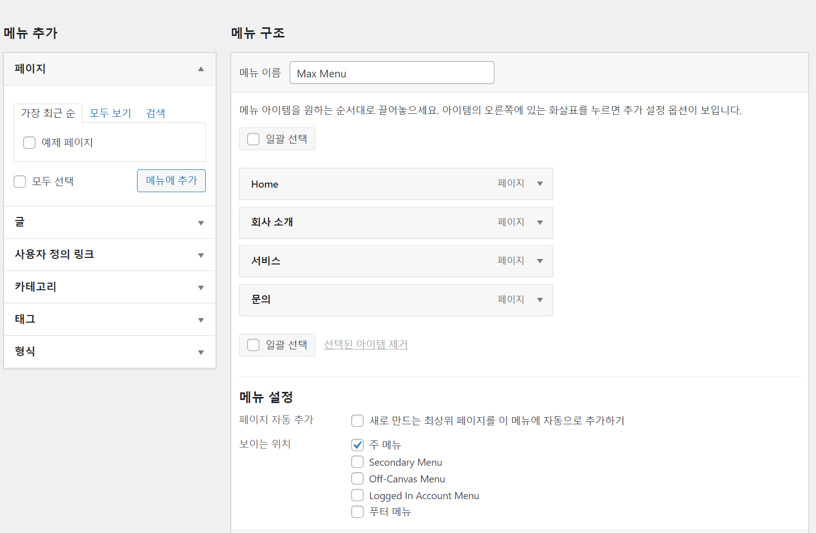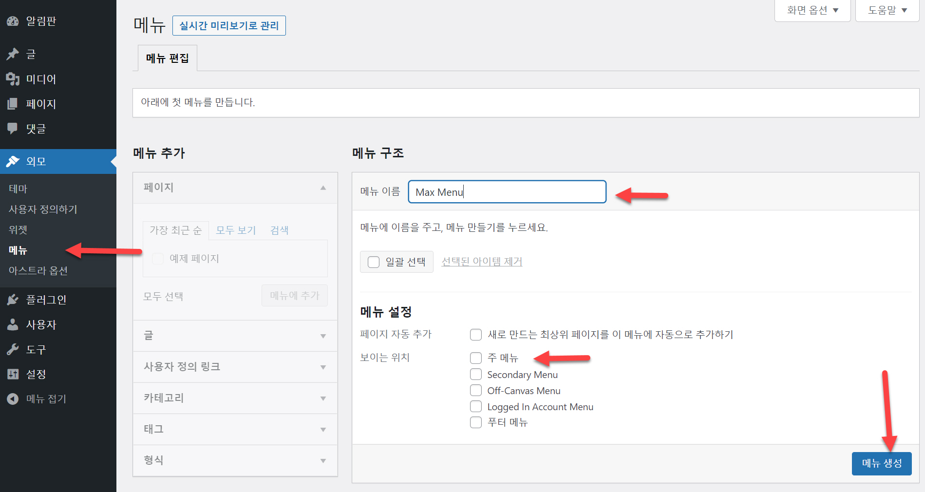 생성된 메뉴가 없다면 메뉴를 만들도록 합니다. 메뉴는 외모 > 메뉴에서 만들 수 있습니다.