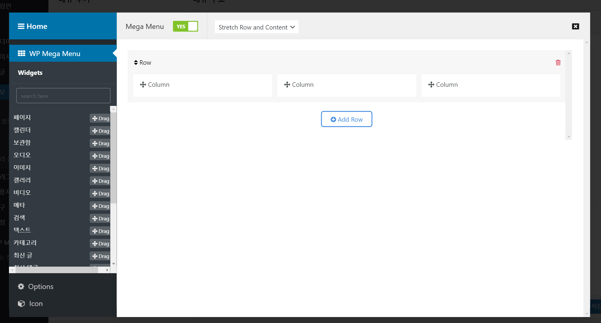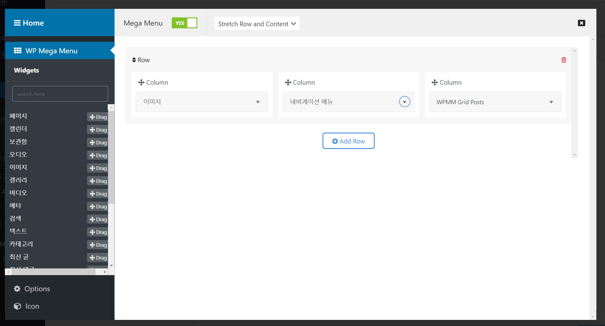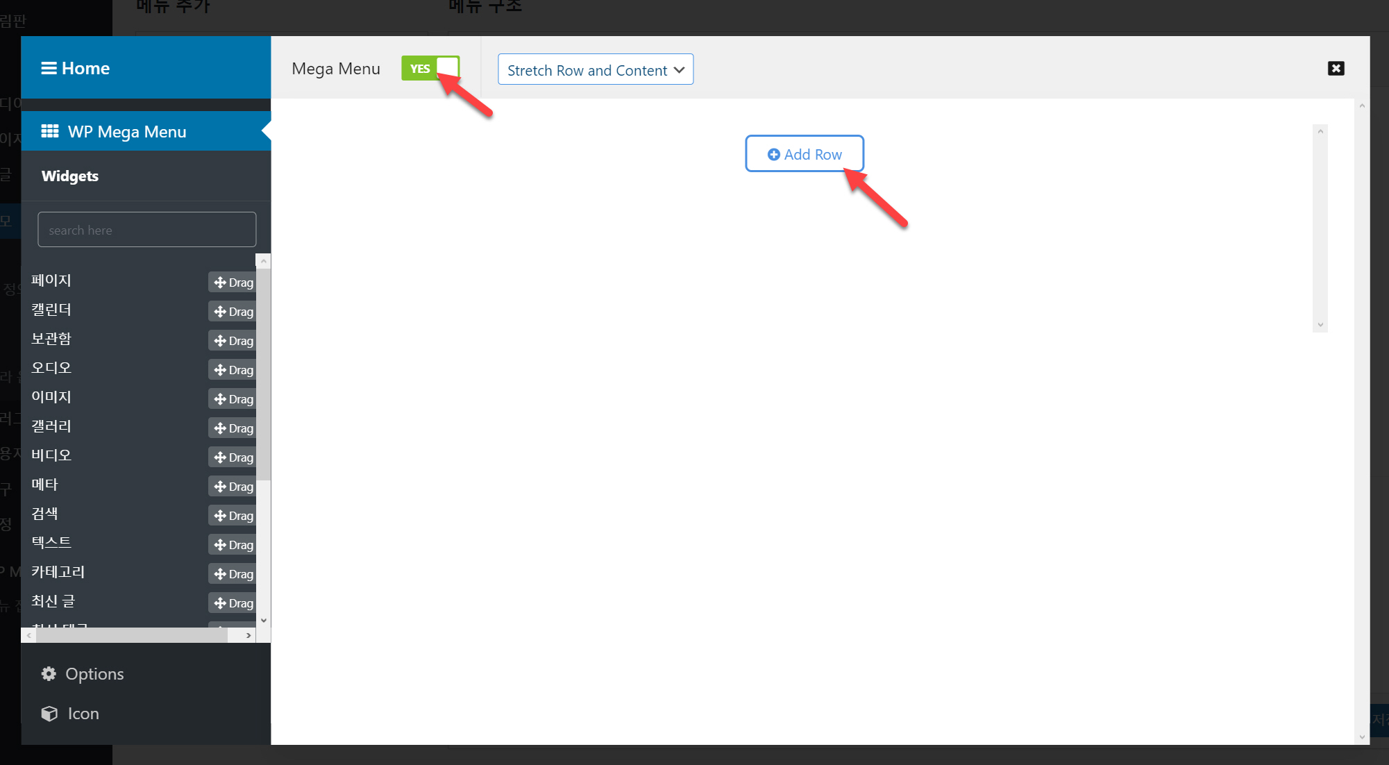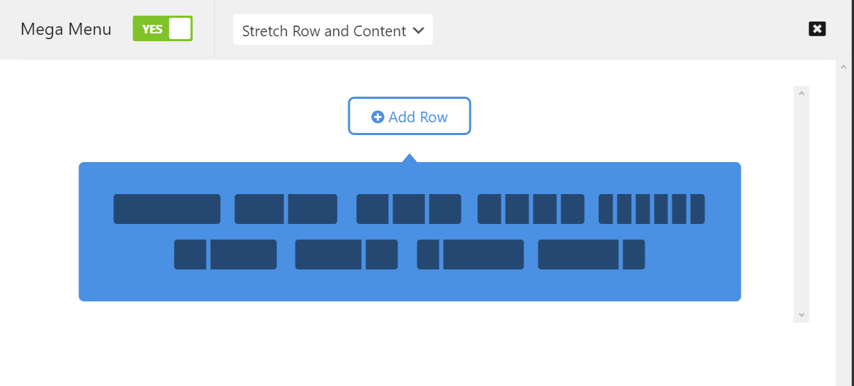 이 아이콘을 클릭합니다. Mega Menu를 Yes로 선택하고 옆의 Select Stretch 옵션을 선택합니다.