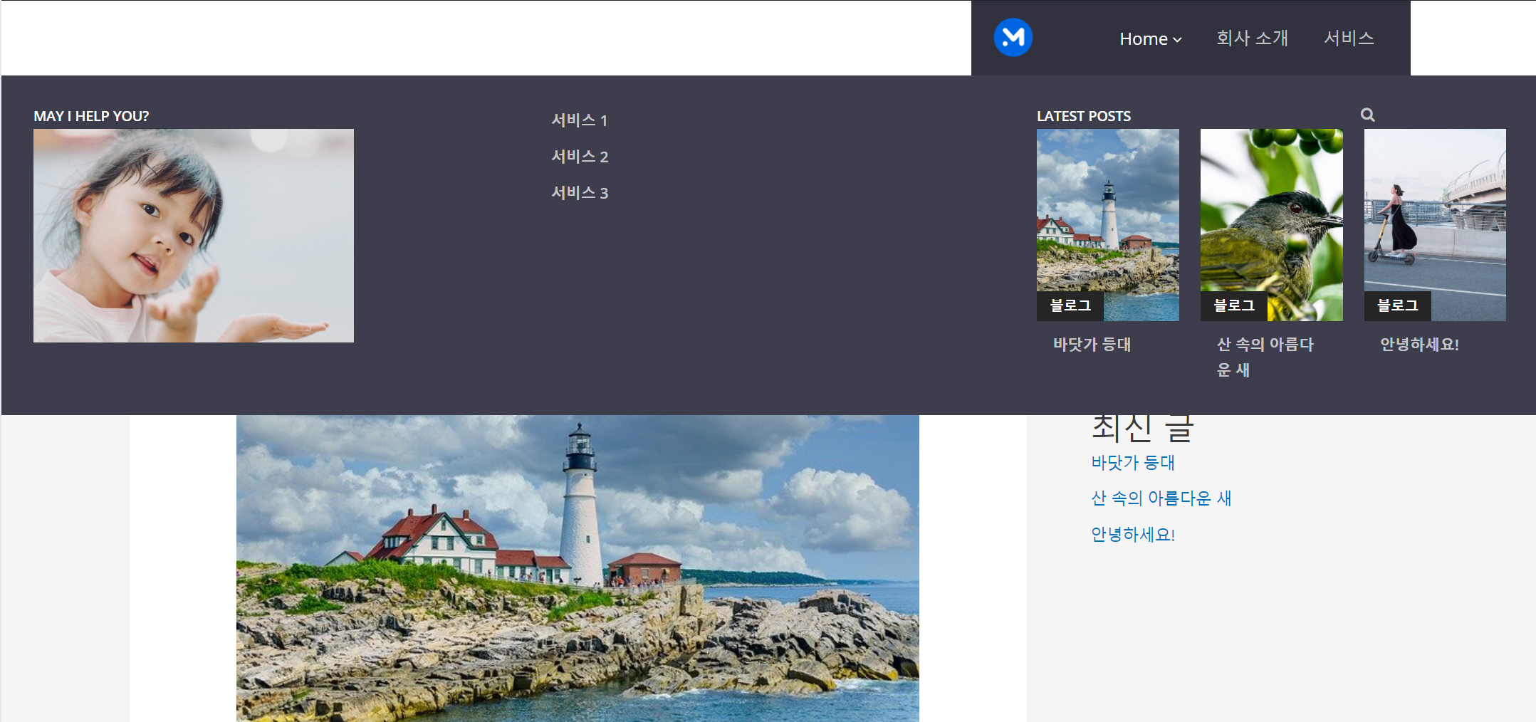 위의 그림과 같이 이미지, 내비게이션 메뉴와 WPMM Grid Posts를 각 열에 추가해보았습니다. 사이트 새로 고침 해보면...