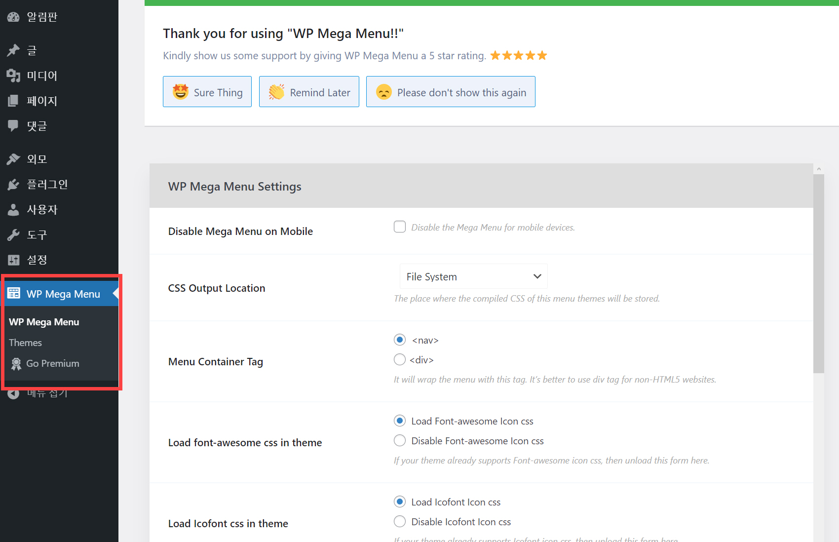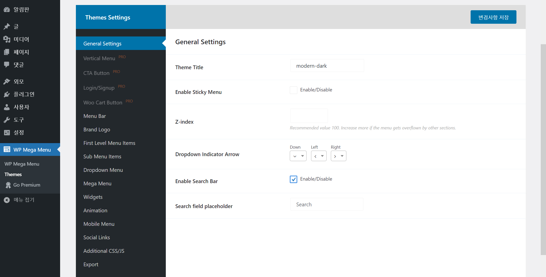 WP Mega Menu > WP Mega Menu에서 일반적인 설정을 할 수 있습니다.