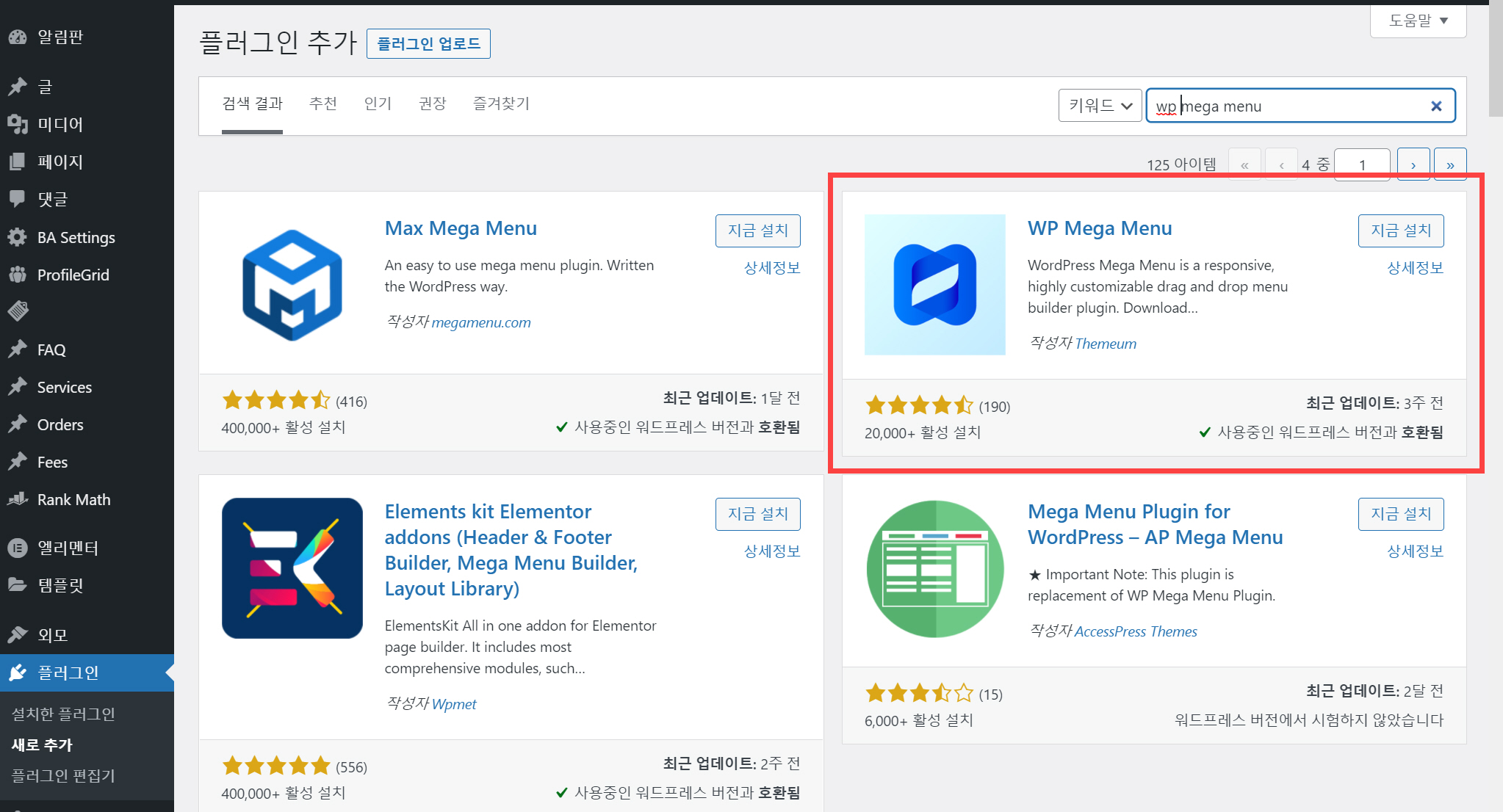먼저 워드프레스 알림판 > 플러그인 > 새로 추가로 이동하여 wp mega menu를 검색하여 WP Mega Menu를 설치합니다.
