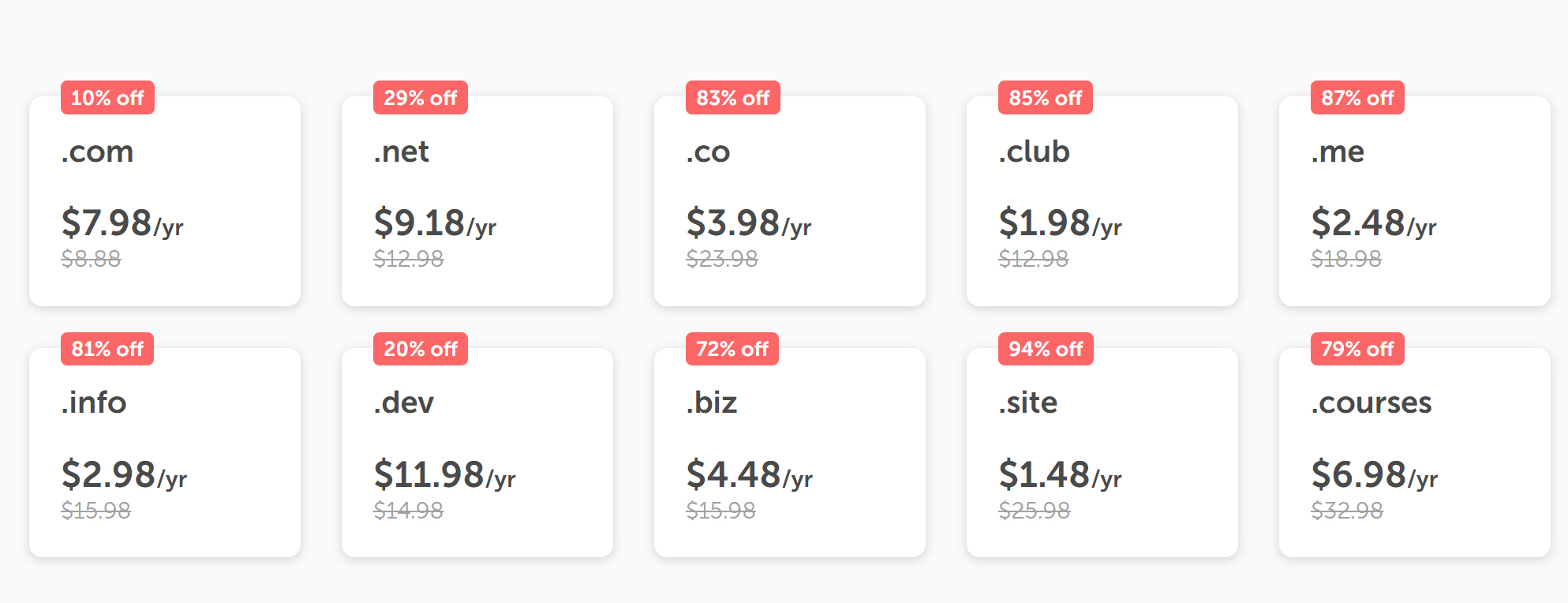 .com 도메인을 등록하려는 경우 Namecheap을 이용하면 비용을 조금 절감할 수 있습니다. 이외의 생소한 도메인(예: .club, .site)은 최대 94%까지 할인된 비용에 등록이 가능하지만, 갱신 시에는 본래 가격이 적용될 것입니다. 또한, 이런 생소한 도메인은 국내에서도 첫 1년 등록비가 1000원인 곳도 있습니다. 하지만 갱신 시에는 본래 가격이 청구됩니다.