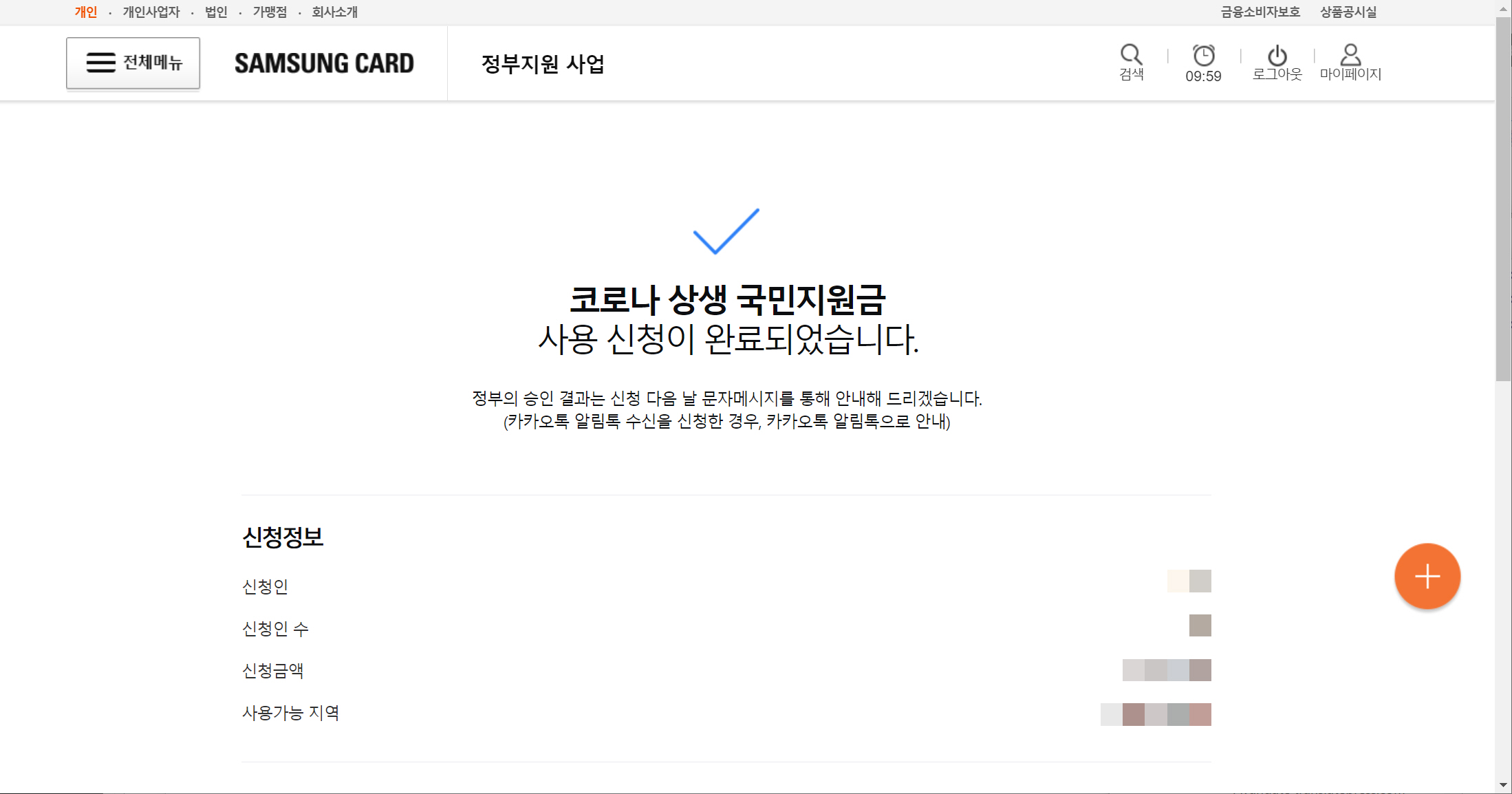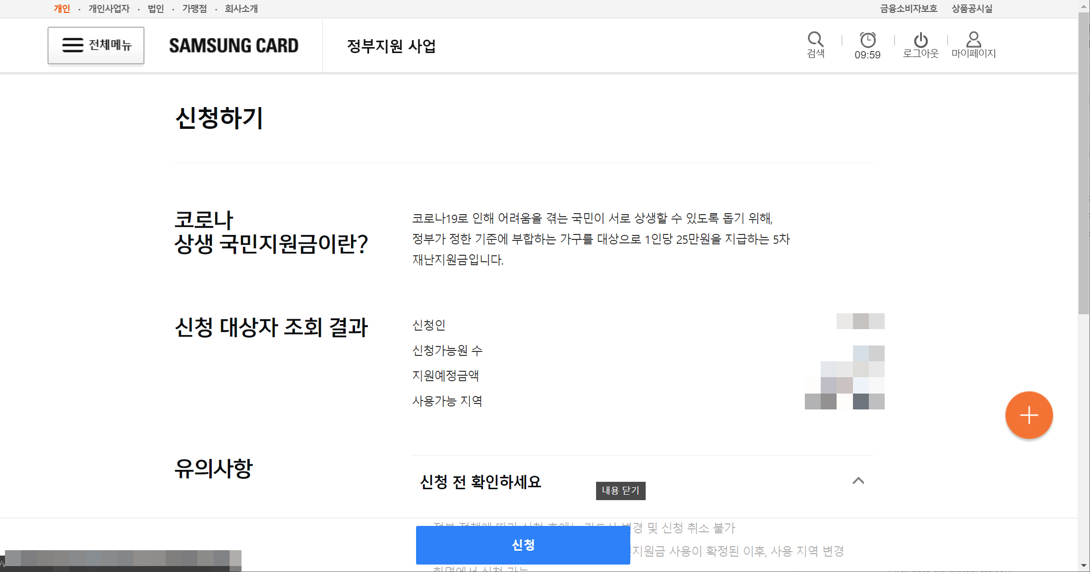 삼성카드 홈페이지에 로그인하면 국민지원금 신청 팝업이 표시됩니다.