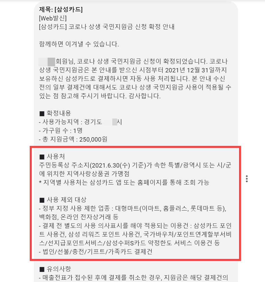 - 정부 지정 사용 제한 업종 : 대형마트(이마트, 홈플러스, 롯데마트 등), 백화점, 온라인 전자상거래 등