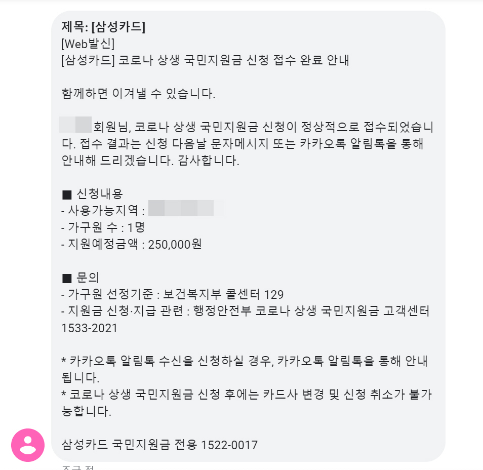 코로나 상생 국민지원금 신청 확정 안내 문자