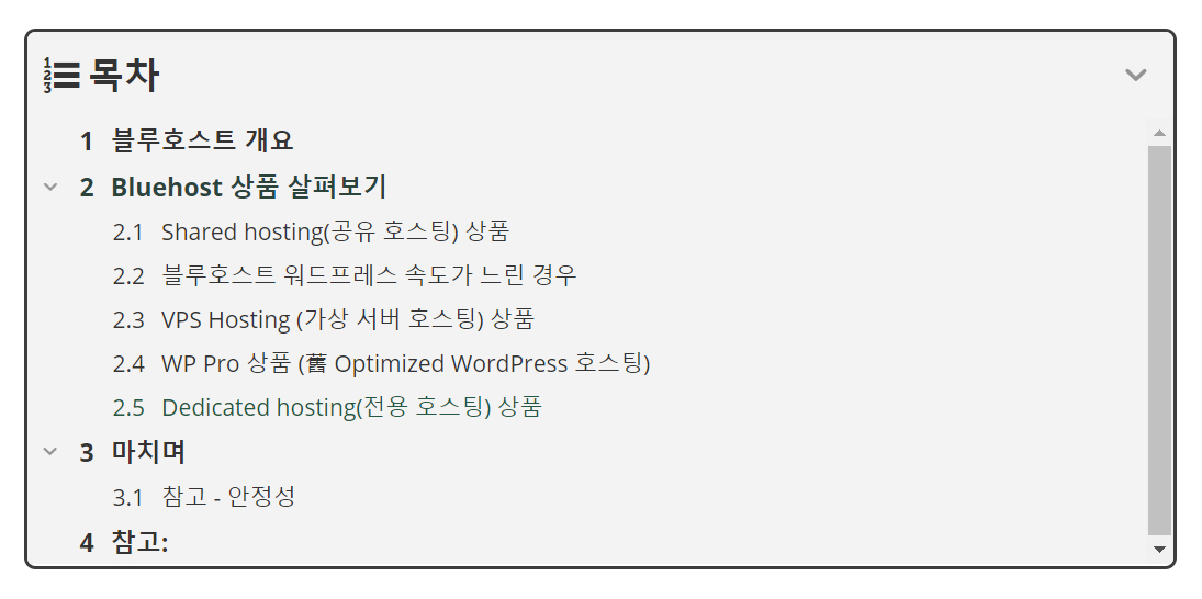 목차를 표시하면 SEO에도 긍정적인 영향을 미치므로, 소제목을 지정하여 글을 작성하는 경우 목차 플러그인을 설치하면 SEO에도 도움이 될 것입니다. (목차 플러그인은 소제목을 인식하여 목차를 생성하며, 최소 소제목 개수 등 상세한 설정이 가능합니다.)