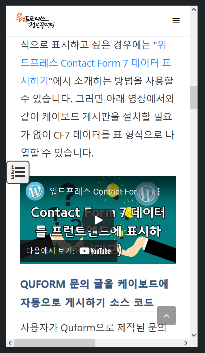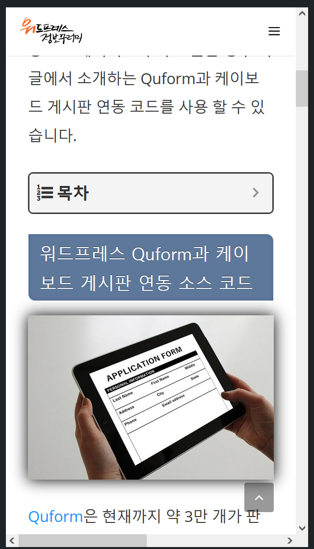 위의 스크린샷은 사용자 정의하기 내에서 표시되는 화면을 캡처한 것으로 실제 모바일에서 표시되는 화면과 차이가 있을 수 있습니다. 실제 작동은 워드프레스 정보꾸러미 블로그의 개별 글에서 확인해볼 수 있습니다.