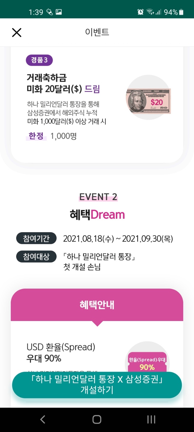 9월 30일까지 하나 밀리언달러 통장 x 삼성증권 연계계좌를 처음으로 개설하는 고객에게 최대 30달러를 제공한다고 합니다.