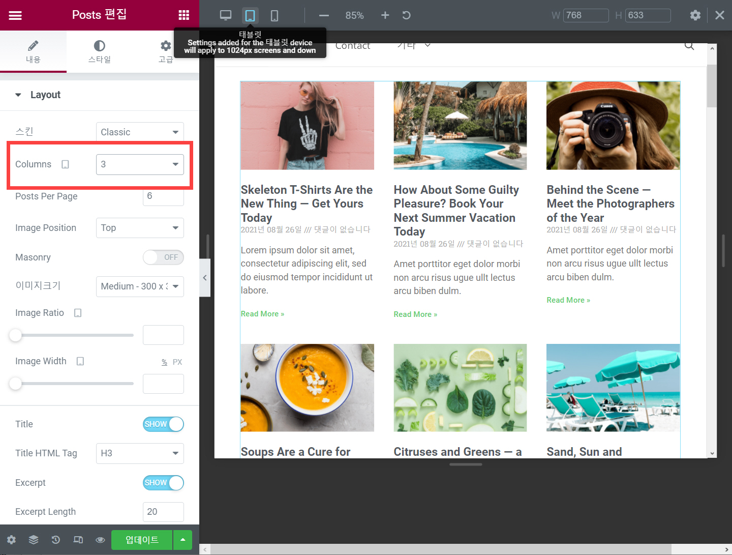 태블릿 기기(중간 크기 화면)에 대해서도 동일한 방법으로 레이아웃을 변경할 수 있습니다. 예를 들어, 태블릿 아이콘을 클릭하고 Colums 옵션을 3으로 설정하면 태블릿에서 3열 레이아웃으로 변경됩니다.
