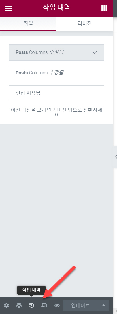 설정을 변경한 후에는 하단의 '업데이트' 버튼을 클릭하여 변경 내용을 적용할 수 있습니다. 변경 내용을 취소하려면 하단의 작업 내역 아이콘을 클릭한 다음, 작업 내역에서 이전 사이트를 선택하여 되돌릴 수 있습니다.