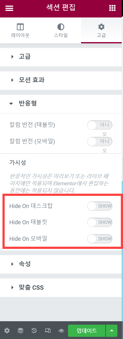 엘리멘토에서는 고급 > 반응형 > 가시성에서 데스크탑, 태블릿, 모바일에서 해당 요소나 섹션을 숨길 수 있습니다. 가령, Hide On 모바일을 HIDE(숨김)로 설정하면 데스크톱과 태블릿에서만 표시되고 모바일에서는 표시되지 않습니다.