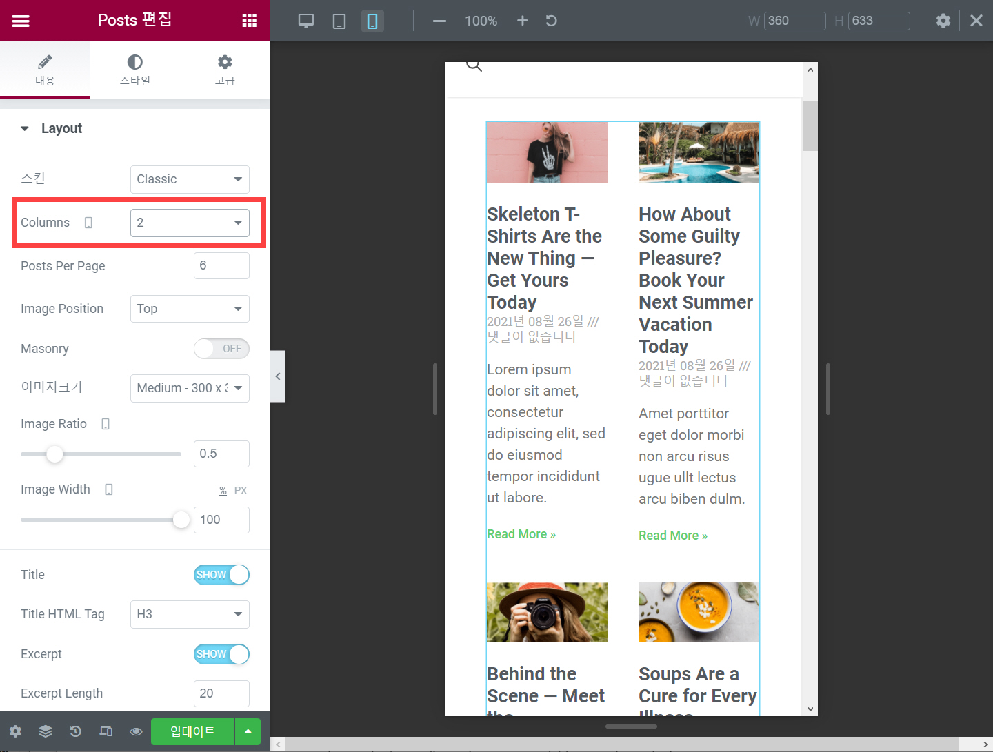 예를 들어, Columns 옵션을 2로 변경하면 모바일에서 1열 레이아웃이 2열 레이아웃으로 바뀝니다.