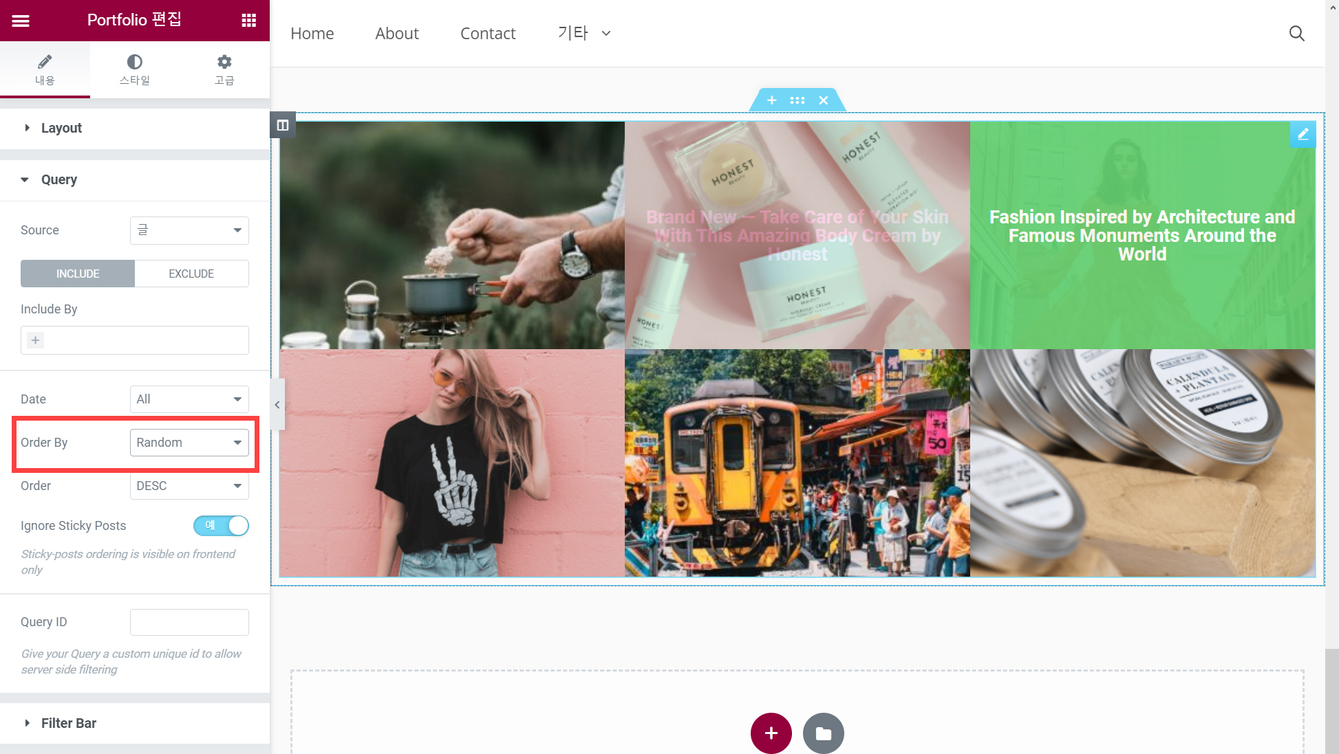 엘리멘터 페이지 빌더의 POrtfolio 위젯 설정.