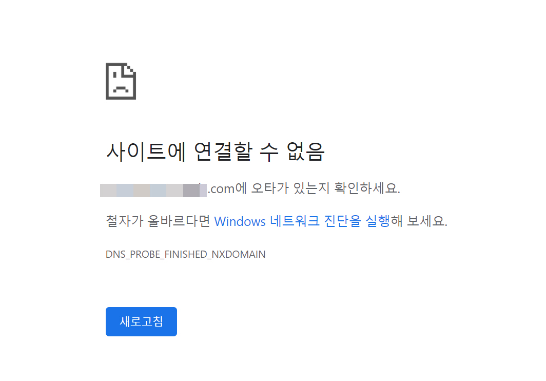 도메인이 연결이 안 되어 사이트에 접속이 안 되는 경우가 있습니다. 이 경우 404 에러가 아닌 다른 에러 메시지가 표시됩니다. 가령, DNS_PROBE_FINISHED_NXDOMAIN 오류가 표시될 수 있습니다.