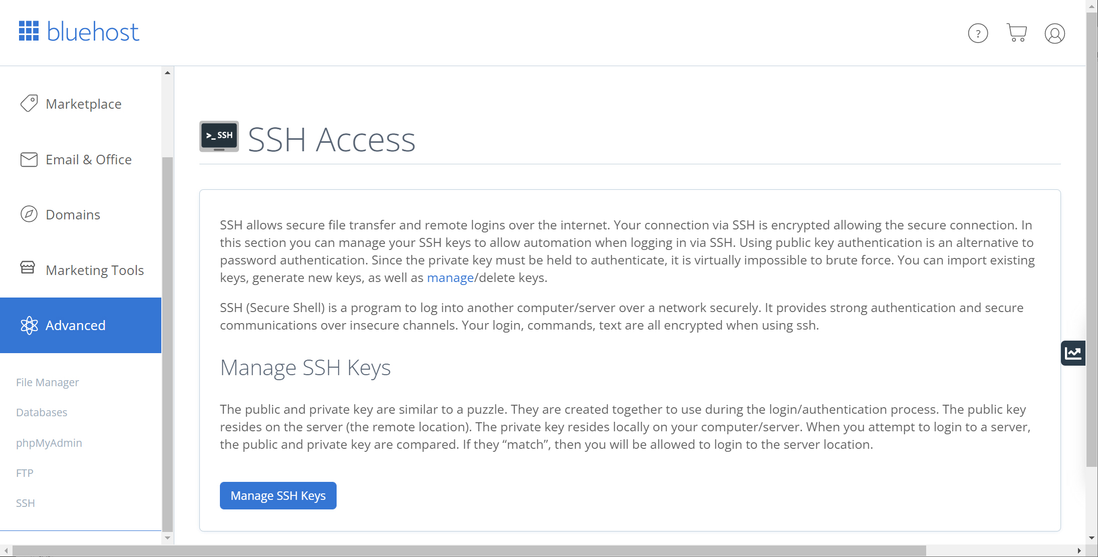 그리고 Advanced > SSH를 클릭하면 SSH 키를 관리할 수 있는 화면이 표시됩니다.