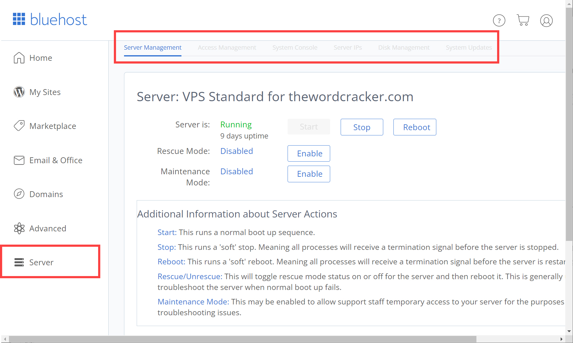 비록 기능은 이전과 거의 동일하고 외관만 달라졌지만, 이제 Bluehost 공유호스팅과 VPS의 인터페이스가 비슷하여 VPS 사용자들이 보다 편리하게 이용할 수 있을 것 같습니다.