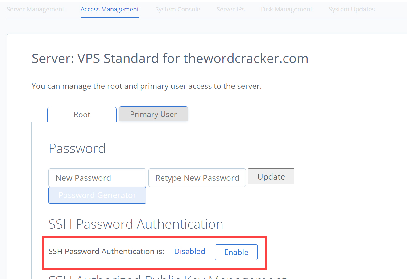 PHP 버전을 변경하는 등 서버 관련 작업을 하려면 Sever > Access Management에서 SSH Password Authentication을 Enable하여 SSH나 WHM에 접속하여 서버 관련 작업을 할 수 있습니다.