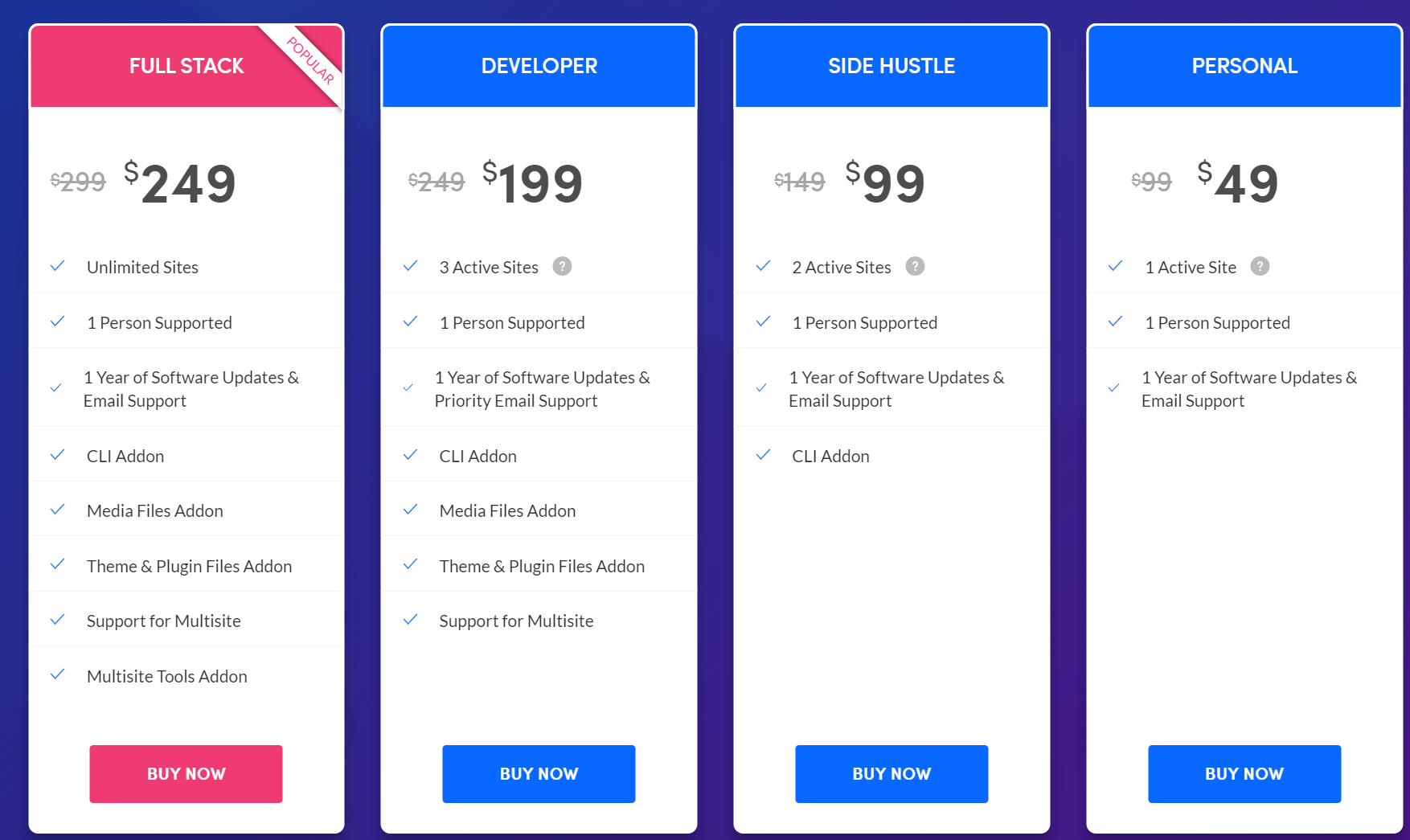 위의 요금표를 보면 Developer 라이선스에서 멀티사이트를 지원(Support for Multisite)한다고 명시하고 있고 Full Stack 라이선스에서는 Multisite Tools Addon을 제공한다고 표시되어 있습니다.
