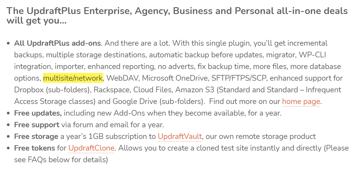 UpdraftPlus 유료 버전을 사용하면 백업본을 사용하여 주소가 다른 워드프레스 사이트에 복원(즉, 마이그레이션)이 가능합니다. 그리고 멀티사이트에서 백업 기능도 지원합니다.