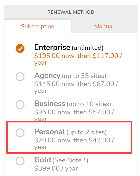 사이트 개수에 따라 Personal, Business, Agency, Enterprise, Gold 등의 플랜이 있습니다. Personal 라이선스의 경우 70달러에 구입이 가능하고 이후 매년 42달러에 갱신할 수 있습니다.