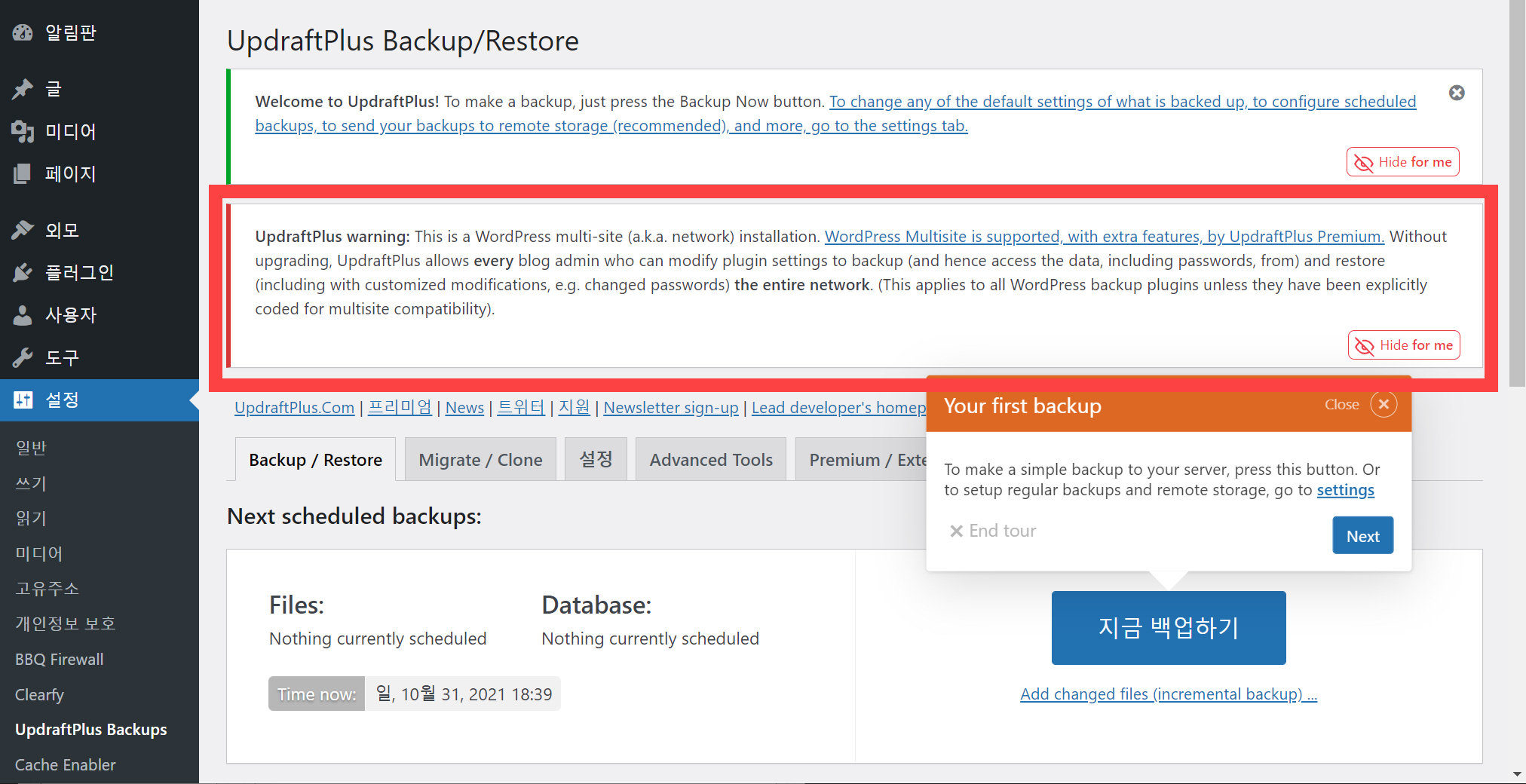 UpdraftPlus 무료 버전을 사용하여 워드프레스 멀티사이트를 백업하면 발생하는 일
